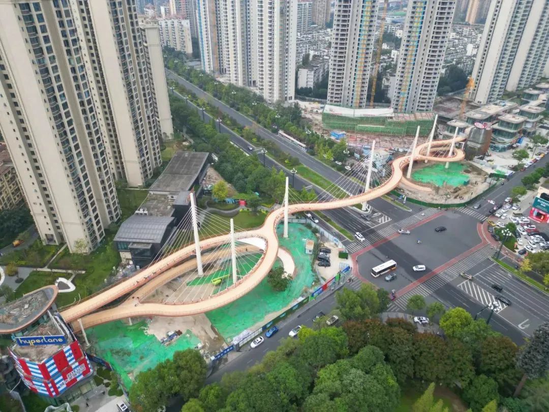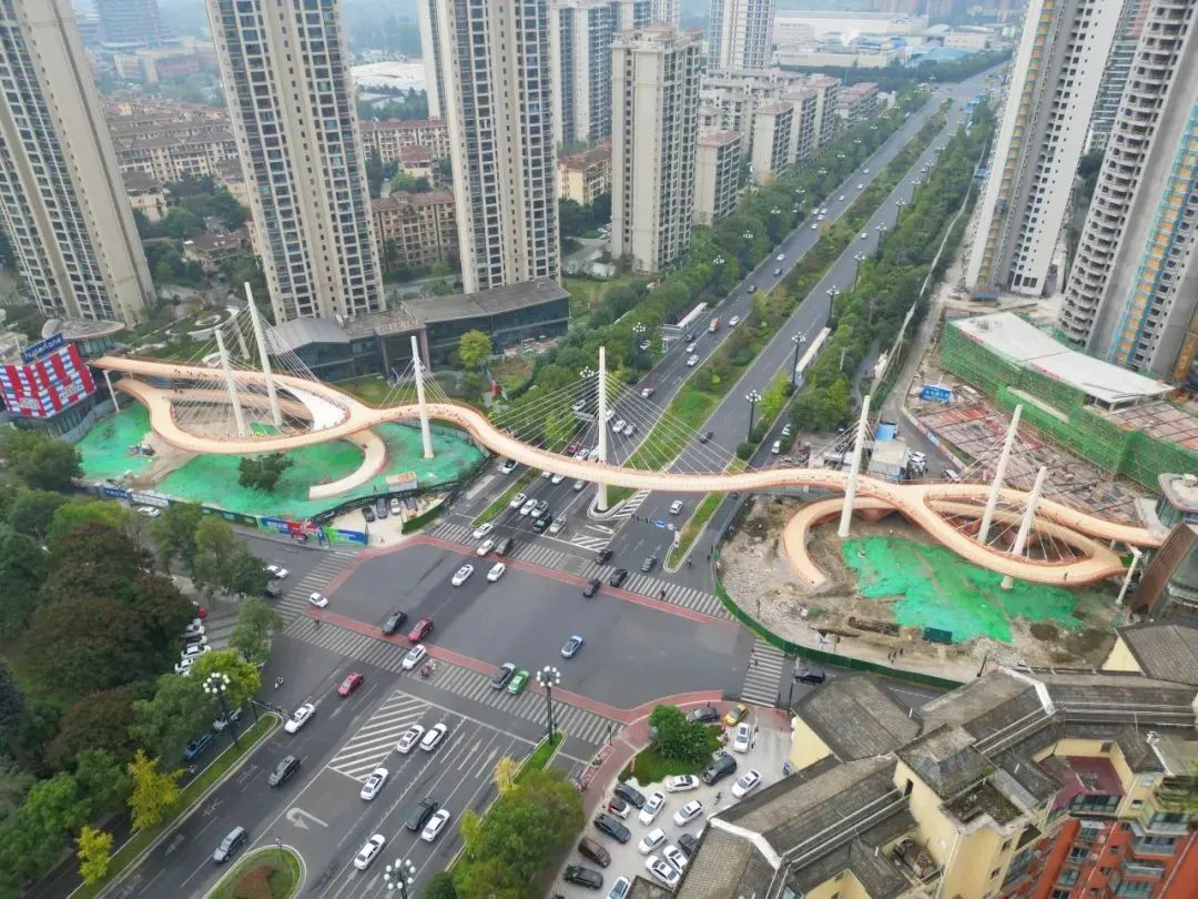 全桥最大的难点在于其所接纳的单塔单索面斜拉手艺,名目团队经由过程三维模子和人行桥温馨性研讨指点降服了钢布局多曲面异形拱架加工建造、高抛自密实砼及桥面薄层铺装施工等手艺坚苦,最大水平削减对周边市民出行的影响,保证了高出骨干道蜀龙路的钢箱梁吊装宁静,终究显现“弦音飘带”的怪异外型。