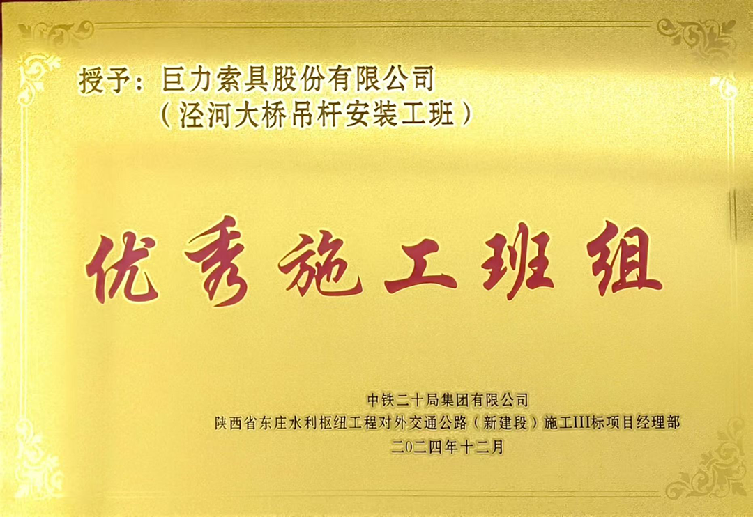 在吊索控制系统设备关头,巨力索具管理人员及时改善完课流程步骤,对吊索控制系统设备张拉后的没变停掉通过观察,保障控制系统设备安装进度与道德,为立交桥的顺遂全线通车提供给了关头有保障。巨力索具管理人员也因超卓的現场主要表现,被类别部授与“高品质安装作业队”的名誉叫。