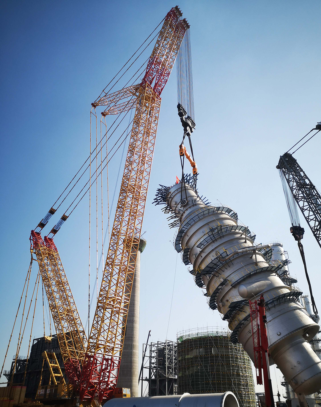 🍬巨力索具的2000t级均衡梁、无讨论绳圈,将盛虹炼化一体化名目常减压蒸馏装配中直径14米,高58米,吊重1717吨的减压塔顺遂吊装就位。